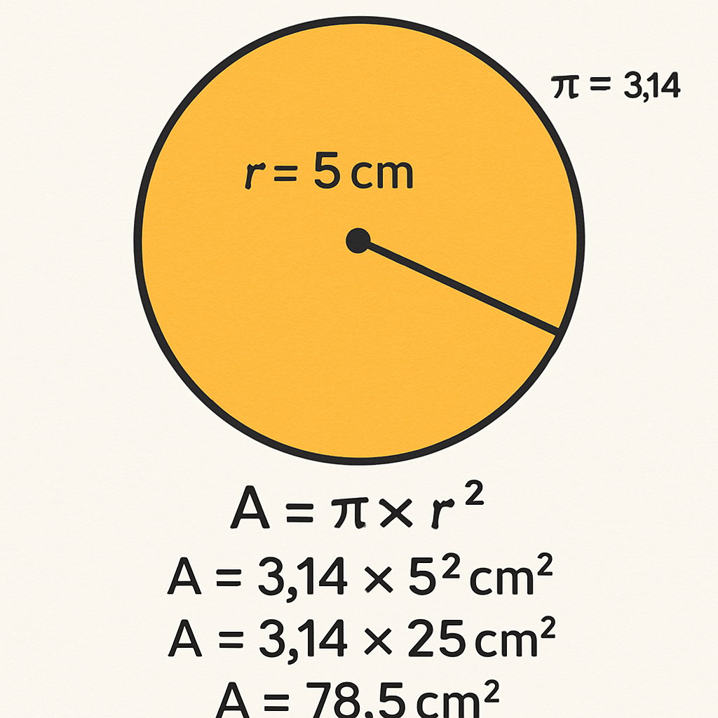 Aplicando a fórmula: A = π × r² A = 3,14 × 5² cm² A = 3,14 × 25 cm² A = 78,5 cm²