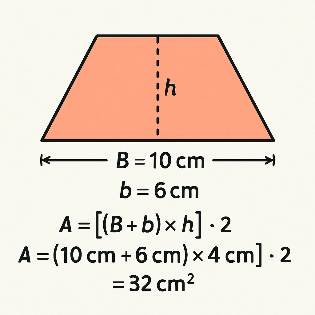 Aplicando a fórmula: A = [(B + b) × h] ÷ 2 A = [(10 cm + 6 cm) × 4 cm] ÷ 2 A = [16 cm × 4 cm] ÷ 2 A = 64 cm² ÷ 2 A = 32 cm²